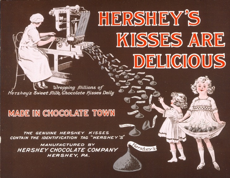 Hershey Advertisement for Milk Chocolate depicting a little girl holding a Hershey bar and the slogan reads: ‘Hershey’s Sweet Milk Chocolate from Chocolate and Cocoa Town’, 1930-1935