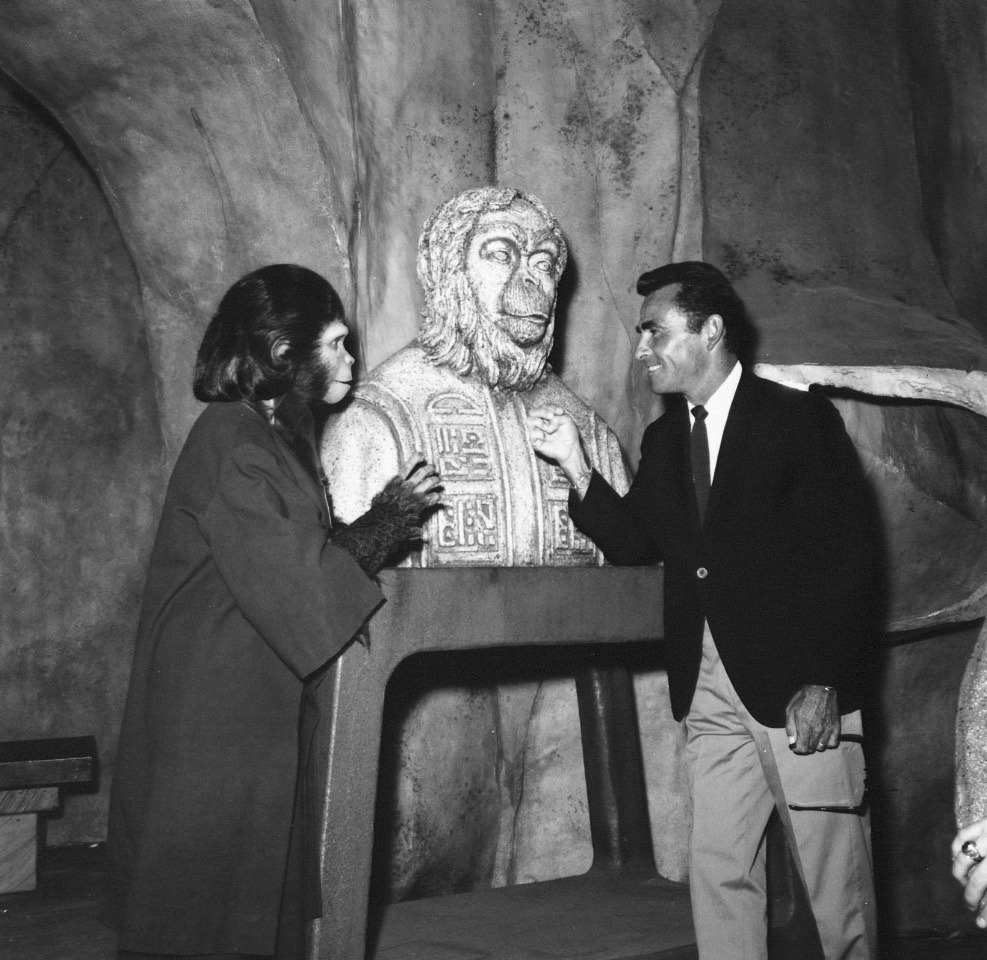 Dr Zira (Kim Hunter) & Rod Serling (December 25, 1924 – June 28, 1975) play knock-knock with The Lawgiver