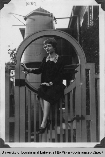 Miss Caro Stephens’ casually sits on the front gate of the Southwest Louisiana Institute President’s residence, 1927