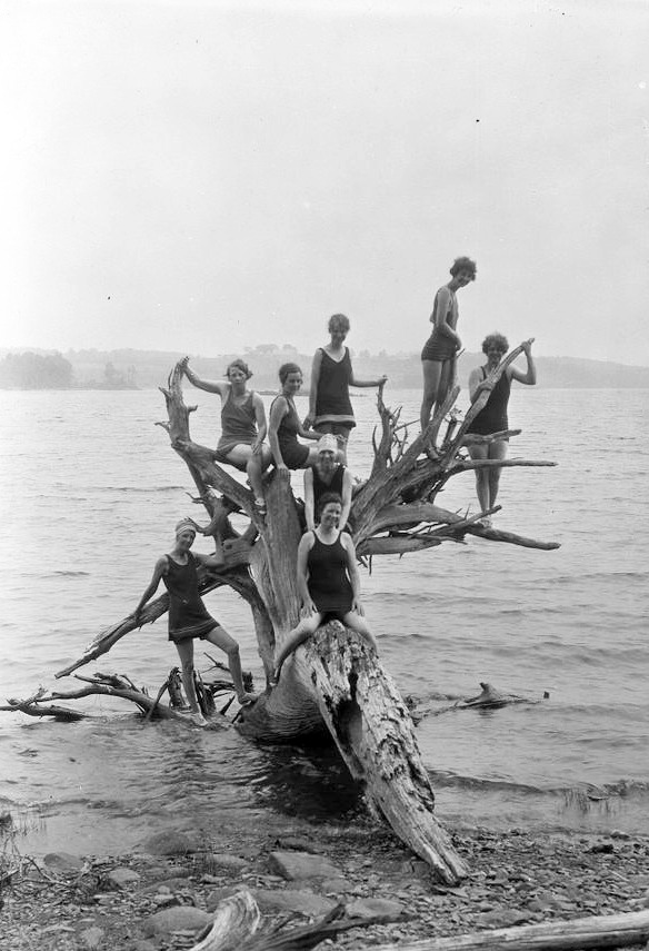 bathing beauties on large driftwood at Camp St. Albans, Maine photo by Bert Call