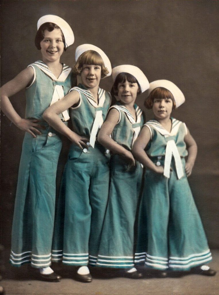 girl visitors take up an advantageous position on one of the guns of HMS Canterbury at Chatham – August 13, 1929