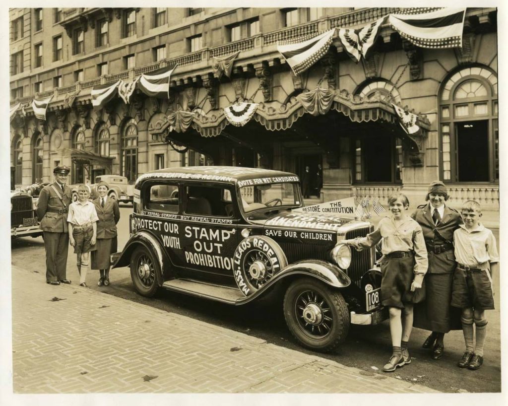 ‘Stamp out Prohibition’ car decorated with Anti-Prohibition slogans, Wilmington, Delaware, circa 1930 we’ll drink to this!